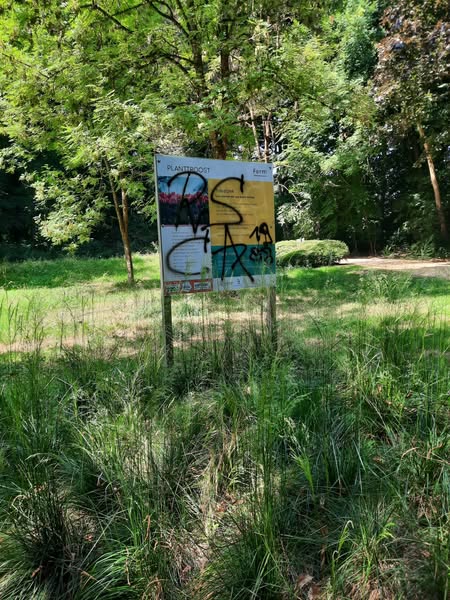 De vandalenstreken beperkten zich bovendien niet tot het Derscheidpark. Ook in het Zeenpark aan de troostplek van STERREBEEK 2000 en OKRA, werd ons troostpaneel (nog maar eens) bespoten met graffiti. Getuigen meldden dat er door hangjongeren ook plastic en ander toxisch vuil verbrand werd.